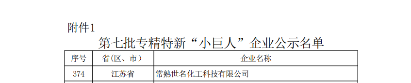 近日,工业和信息化部正式公示第七批专精特新“小巨人”企业名单。常熟世名化工科技有限公司凭借其在行业领域的深厚沉淀与卓越的创新实力,成功通过认定,荣膺国家级专精特新“小巨人” 企业称号。