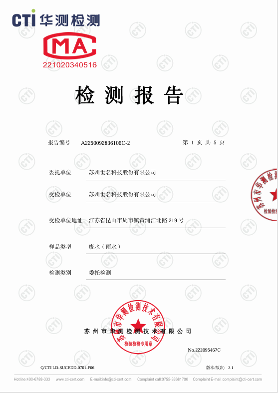 2025年10月27日,苏州世名科技股份有限公司委托第三方检测公司苏州市华测检测技术有限公司于苏州世名科技股份有限公司厂区北侧雨水排放口取雨水水样进行检测,监测指标为COD(化学需氧量)、悬浮物和PH值,检测结果:COD:17.3mg/l,悬浮物:12mg/l ,PH:7.16,水质结果判定符合《地表水环境质量标准》标准中表1中IV类标准,COD:30 mg/l,PH值范围:6-9,悬浮物:70 mg/l。