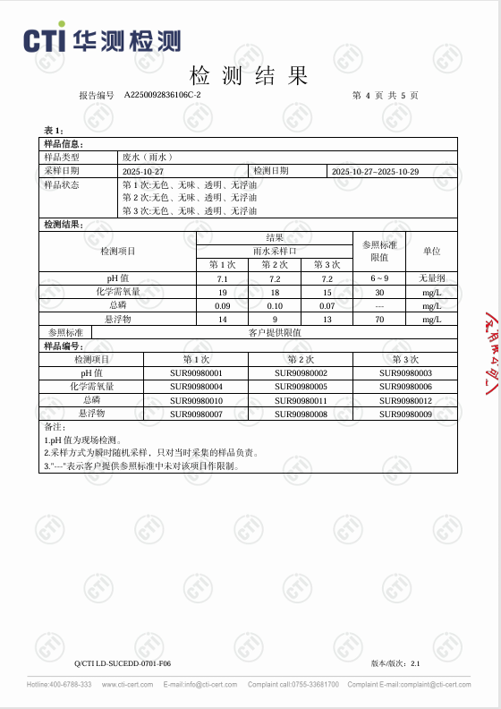 根据《中华人民共和国水污染防治法》及排污许可证自行监测管理相关规定,苏州世名科技股份有限公司按照《地表水环境质量标准》GB3838-2002及《水和废水监测分析方法》的规定,于2025年10月27日完成了2025年第四季度雨水水质的监测工作。现将水质监测结果公示如下: