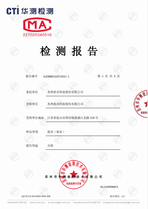 苏州世名科技股份有限公司2026年第一季度雨水监测结果公示