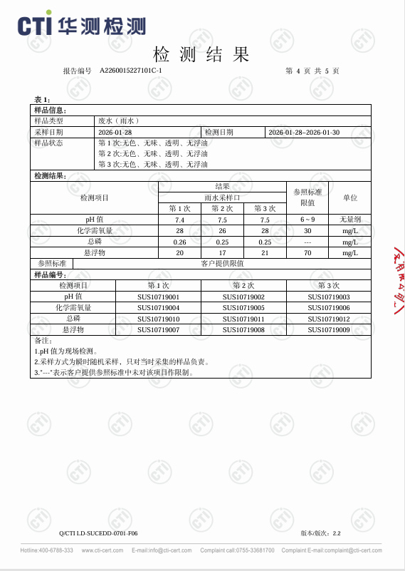 根据《中华人民共和国水污染防治法》及排污许可证自行监测管理相关规定,苏州世名科技股份有限公司按照《地表水环境质量标准》GB3838-2002及《水和废水监测分析方法》的规定,于2026年1月30日完成了2026年第一季度雨水水质的监测工作。现将水质监测结果公示如下: