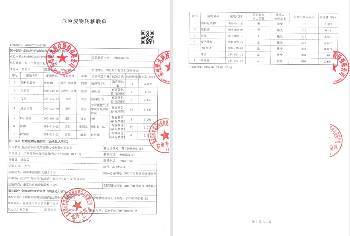 2026年4月8日,苏州世名科技股份有限公司委托危险废弃物运输单位昆山市尚升危险废物专业运输有限公司、处置单位张家港市华瑞危险废物处理中心有限公司转移及处置危险废弃物,所转移及处置的危险废弃物分别为:滤渣(264-011-12)1.071吨、颜料包装物(900-041-49)5.882吨、污泥(264-012-12)3.607吨、废机油(900-249-08)0.46吨、废活性炭(900-039-49)5.637吨、PMA废液(900-409-06)0.003吨、浓缩液(264-011-12)2.671吨,所处置及转移的危险废弃物经过《江苏省生态环境厅江苏省污染源“一企一档”管理系统》申报审批通过,转移及处置量在危险废弃物管理计划内。